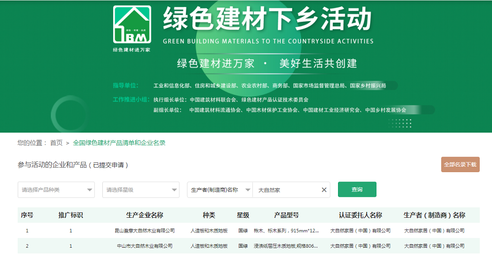 綠色建材下鄉(xiāng)對于入選產(chǎn)品有著嚴(yán)苛的審核標(biāo)準(zhǔn),入選產(chǎn)品必須是在全生命周期內(nèi)可減少對天然資源消耗和減輕對生態(tài)環(huán)境影響,具有“節(jié)能、減排、安全、便利和可循環(huán)”特征的建材產(chǎn)品。2021年,大自然強(qiáng)化地板、實木復(fù)合地板憑借環(huán)保基材和環(huán)保工藝技術(shù),經(jīng)過專業(yè)檢測機(jī)構(gòu)的層層檢測與認(rèn)證,獲得了綠色產(chǎn)品認(rèn)證證書。該證書是證明企業(yè)的產(chǎn)品在全生命周期中均符合綠色發(fā)展理念,也是綠色建材下鄉(xiāng)的重要通行證。